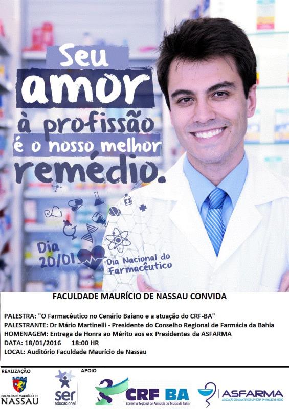 A ASFARMA, em parceria com a Faculdade Maurício de Nassau, convida a todos para a palestra: “O Farmacêutico no cenário baiano e a atuação do CRF-BA”, no dia 18/01/2016 (próxima segunda-feira) às 18 horas, no Auditório da Faculdade Maurício de Nassau – Av. Otávio Santos, 158 – Centro, Vitória da Conquista. :: LEIA MAIS »