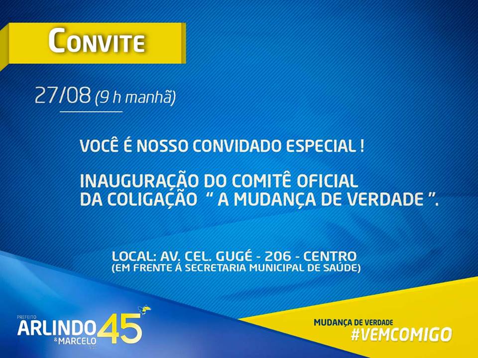 Na manhã deste sábado (27), em Vitória da Conquista, será inaugurado o comitê oficial de campanha do candidato a prefeito Arlindo Rebouças, e de seu vice, Marcelo Melo. Os dois representantes políticos fazem parte da coligação “A Mudança de Verdade”.