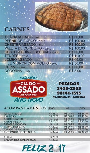 Você não escolheu ainda seu buffet de Ano Novo, que tal conferir as opções de carnes e acompanhamentos da Cia do Assado? Lá você encontra uma grande variedade: tilápia assada, pernil de porco, chester, paleta de cordeiro, entre outras opções.