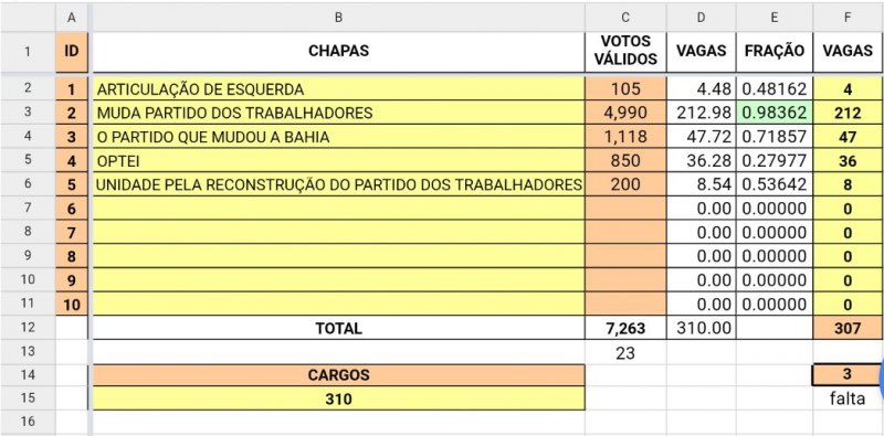 Com 7.263 votos válidos apurados, a chapa Muda PT, do candidato deputado federal Waldenor Pereira, está na dianteira com 4.990 votos. Em seguida aparece a chapa Partido que Mudou a Bahia com 1.128 votos (14,9%). A chapa Optei conta com 890 votos (8,2%). Enquanto a chapa Unidade pela Reconstrução soma 200 votos (2,3%) e a chapa Articulação de Esquerda tem 105 votos (1,2%).