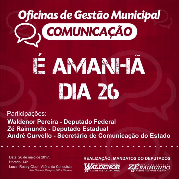 Amanhã às 14h no Rotary Club, situado na Avenida Siqueira, os deputados Waldenor Pereira e José Raimundo estarão reunidos na sede da entidade onde realizarão o evento Oficinas de Gestão Municipal.