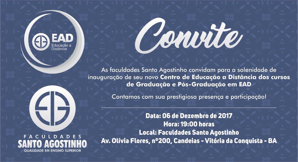 No próximo dia 06/12, às 19h na sua sede à Avenida Olívia Flores, as faculdades Santo Agostinho inauguram seu novo Centro de Educação a Distância dos Cursos de Graduação e Pós-Graduação em EAD.