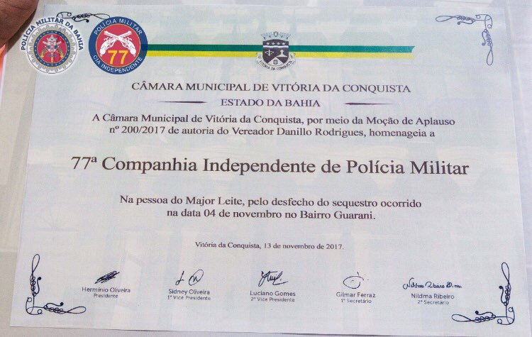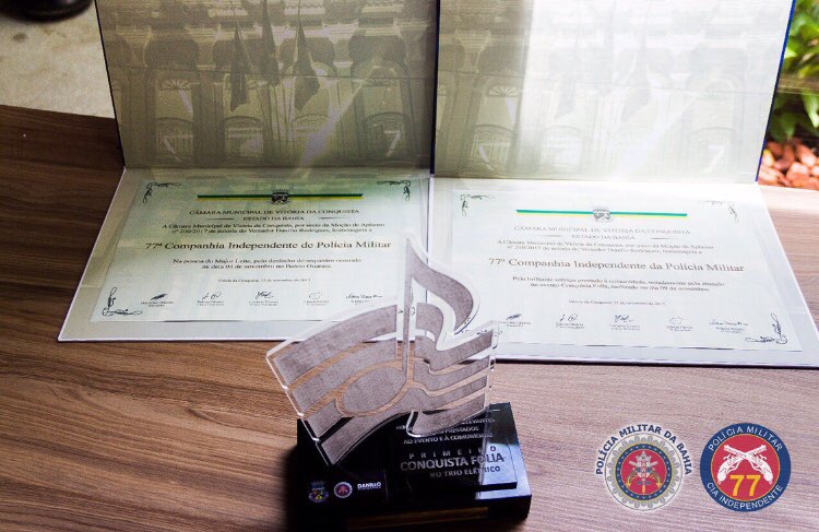 Policiais militares da 77ª Companhia Independente de Polícia Militar receberam na manhã desta sexta-feira (01), da Câmara Municipal de Vereadores de Vitória da Conquista, duas moções de aplausos pelo bom trabalho que vêm desenvolvendo na cidade.