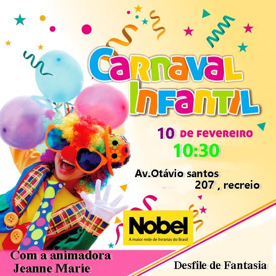 A Livraria Nobel, na Avenida Otávio Santos, vai realizar uma folia dirigida ao público infantil a partir das 10:30 de hoje, contando com desfile de fantasias além de um bailinho para colocar a meninada desde cedo no clima de carnaval.