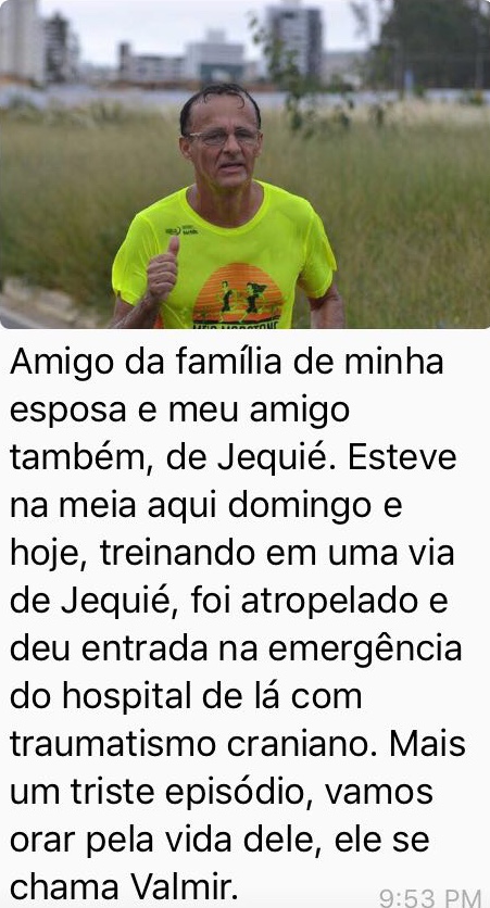Ontem por volta das 22 horas Marcelo ainda conseguiu me encontrar acordado e me enviou uma triste notícia protagonizada na nossa querida cidade de Jequié, onde um atleta corredor quase teve a sua vida ceifada após ser atropelado por um automóvel que, quem sabe, teria sido imprudente e quase tirou da face da terra mais um atleta indefeso. Marcelo na sua mensagem recorre a todos nós pedindo que roguemos a Deus pela recuperação do seu amigo: