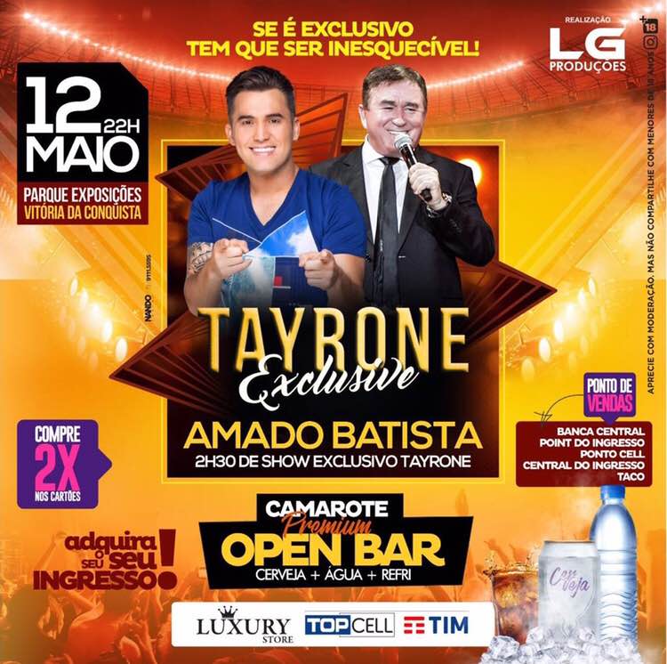 Dois grandes nomes, duas vozes que embalam os apaixonados. Juntos então… não há coração que aguente. A data é sugestiva, 12 de maio, a produção escolheu com carinho. Amado Batista, nome consagrado no cenário nacional, tem uma relação de respeito com o seu imenso público. Quem ama gosta. “Amado, é Amado, não tem pra ninguém”, afirmam os fãs que já compraram ingressos para o próximo dia 12 de maio no Parque de Exposições e que contará com um camarote exclusivo, com muito conforto, segurança e serviço diferenciado, segundo os organizadores do evento. “Chega o São João, mas o dia 12 de maio, é tão bom que fica pirraçando a gente e não chega nunca”, dizem os fãs morrendo de ansiedade. :: LEIA MAIS »