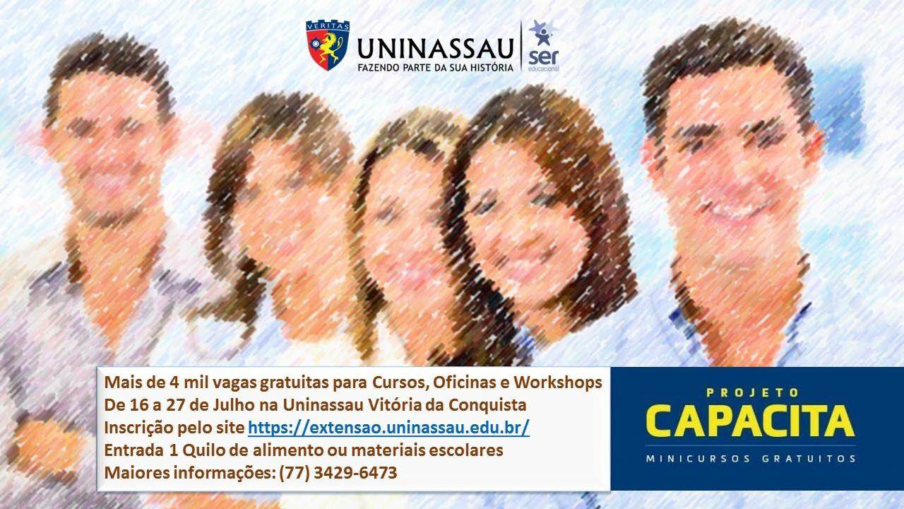 Entre os dias 16 e 27 de Julho, a Faculdade Uninassau de Vitória da Conquista, no Sudoeste da Bahia, realiza o projeto “Capacita 2018.2”. A ação oferece cursos para ajudar na qualificação profissional dos alunos e da população durante o período de férias. Nesta edição, serão ofertados cerca de 4.000 vagas em 40 cursos gratuitos. As atividades acontecem das 19h às 22h na unidade.