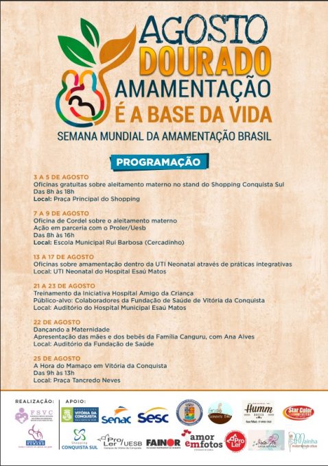 Teve início nesta sexta-feira (3), às 11h, a programação de atividades do “Agosto Dourado”, em Vitória da Conquista. Com o tema “Amamentação é a base da vida”, a equipe do Banco de Leite do Esaú Matos vai levar para o stand montado no Shopping Conquista Sul oficinas gratuitas acerca do aleitamento materno.