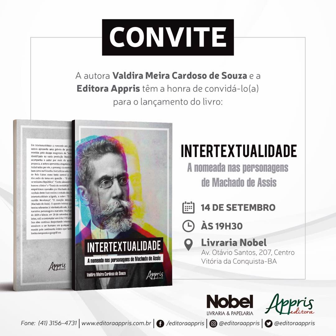 A Livraria Nobel se constitui no abrigo dos saberes, dos românticos, dos poetas e dos escritores. O final de tarde frio é o prenúncio de uma ótima noite e a intelectualidade conquistense terá a oportunidade de usufruir de um momento de cultura quando a escritora Valdira Meira Cardoso de Souza lançará o seu livro “Intertextualidade”, a partir das 19:30 você é convidado(a) muito especial para se aconchegar sob o manto protetor dos amantes das artes e da leitura, a Livraria Nobel.