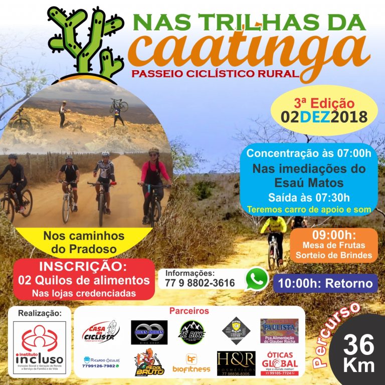 Depois do sucesso das primeiras edições do projeto Nas Trilhas da Caatinga, que conseguiram reunir quase duzentos ciclistas de vários bairros conquistenses, distribuídos entre veteranos e iniciantes, homens, mulheres, jovens, idosos e até uma criança, o Instituto Incluso realizará neste domingo, 02, a terceira edição do seu passeio.