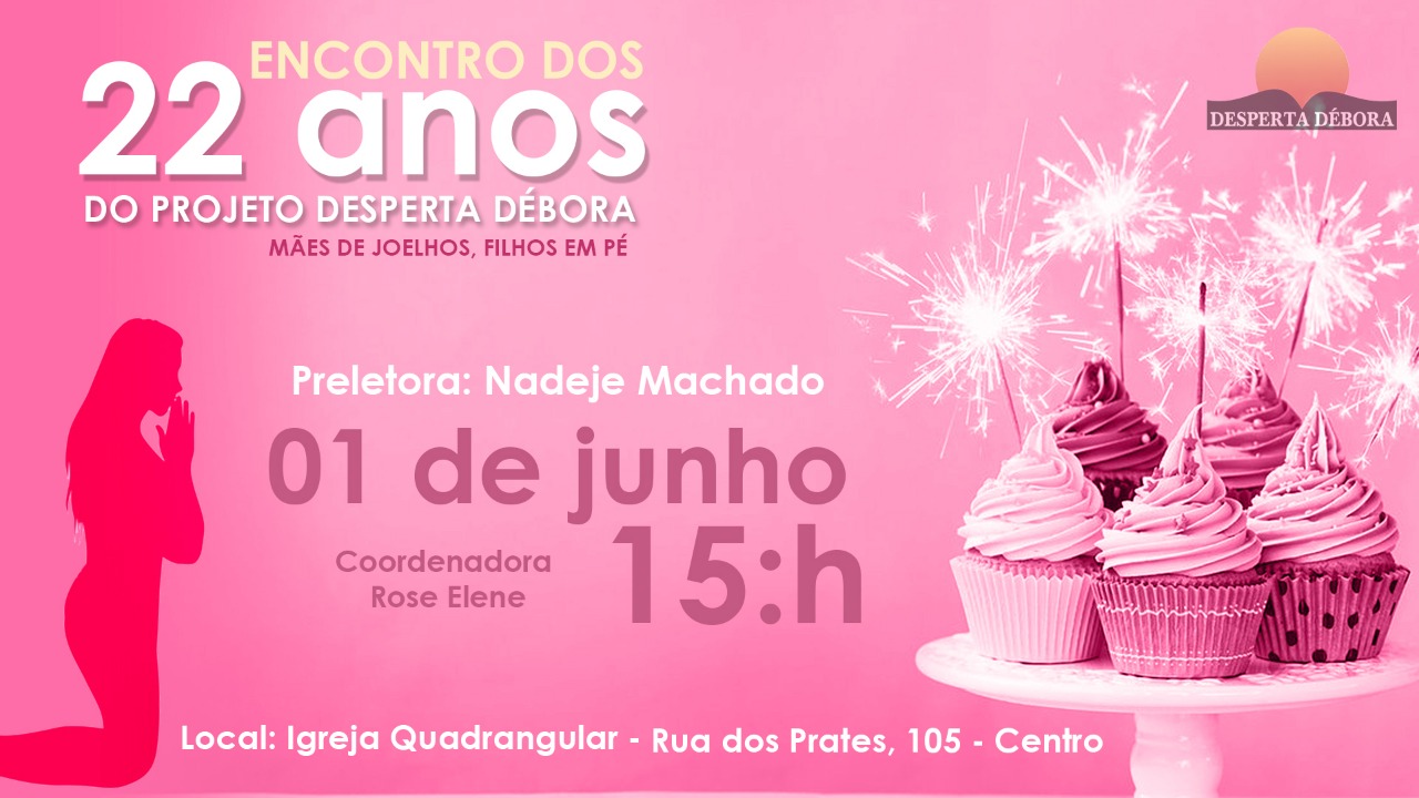 “No próximo sábado, dia 01 de junho, o Projeto “Desperta Débora – Mães de Joelho, Filhos em Pé” comemora 22 anos de existência em Vitória da Conquista. A celebração acontece na Catedral da Primeira Igreja do Evangelho Quadrangular, situada na Rua dos Prates, nº 105, no centro da cidade, com início às 15h. A Preletora será a Pastora na Igreja Batista Nova Sião, Nadeje Machado. :: LEIA MAIS »