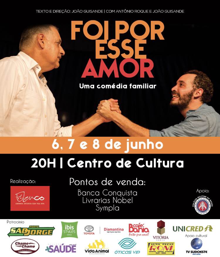 Está chegando a hora! Já na próxima semana o espetáculo “Foi por esse amor – uma comédia familiar” chega a Vitória da Conquista para apresentações de 06 a 08 de junho no Centro de Cultura. A peça desembarca por aqui após quatro temporadas de sucesso absoluto de público e crítica em Salvador: foi com ela que João Guisande, que também assina o roteiro e a direção, venceu o prêmio Braskem 2019 na categoria melhor ator.
