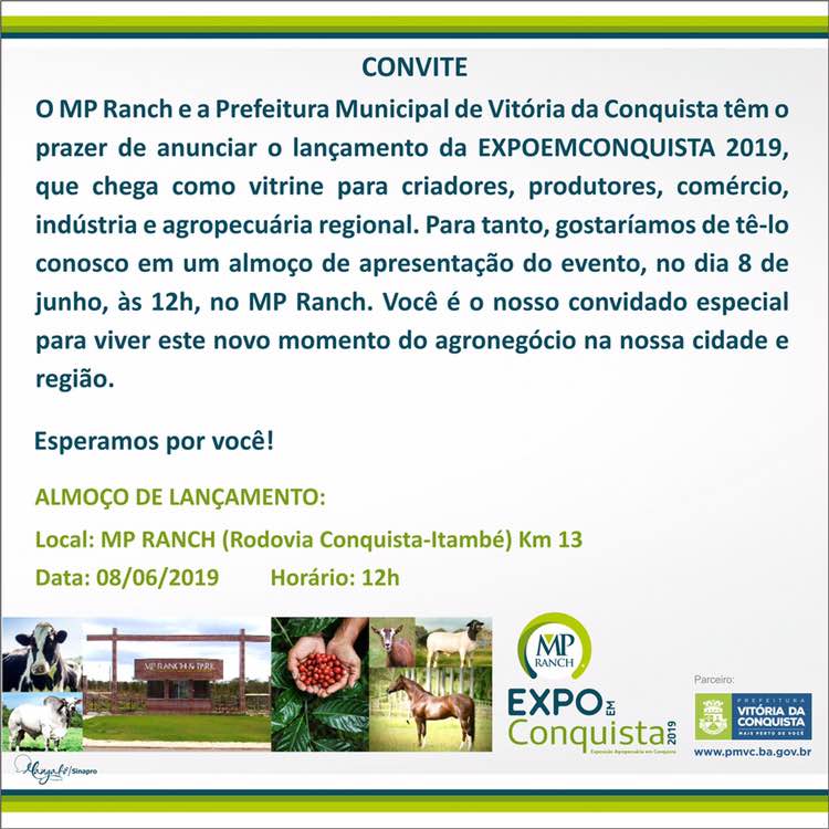 A Prefeitura Municipal de Vitória da Conquista está anunciando a realização da EXPOEMCONQUISTA em parceria com o MP Ranch, cujo lançamento dar-se-á no próximo dia 08 de junho em um almoço dirigido aos empresários do setor agropecuário.