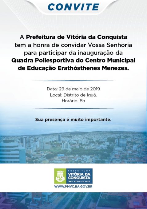 A Prefeitura Municipal de Vitória da Conquista entrega nesta quarta-feira (29) a quadra poliesportiva do Centro Municipal de Educação Erathósthenes Menezes. A solenidade será, às 8h, na sede da escola no povoado de Iguá. Estarão participando do evento representantes da Prefeitura Municipal, comunidade escolar além da população da região.