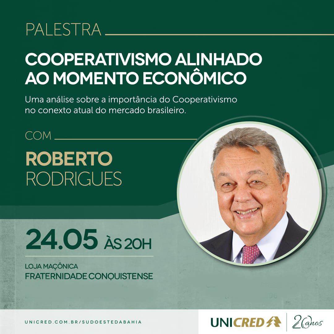 “O cooperativismo é um instrumento cada vez mais respeitado na defesa da estabilidade democrática e do desenvolvimento de uma consciência solidária no país”. A afirmação é do coordenador do Centro de Agronegócios da Fundação Getúlio Vargas e ex-ministro da Agricultura, Pecuária e Abastecimento, entre 2003 e 2006, Roberto Rodrigues. Professor de cátedra de agronegócios da Esalq/USP e também embaixador especial da Organização das Nações Unidas para a Alimentação e Agricultura (FAO), Roberto Rodrigues estará em Vitória da Conquista para uma palestra sobre o tema. O especialista vem à cidade a convite da Unicred Sudoeste. O evento faz parte das comemorações pelos 20 anos de atuação da cooperativa na região.