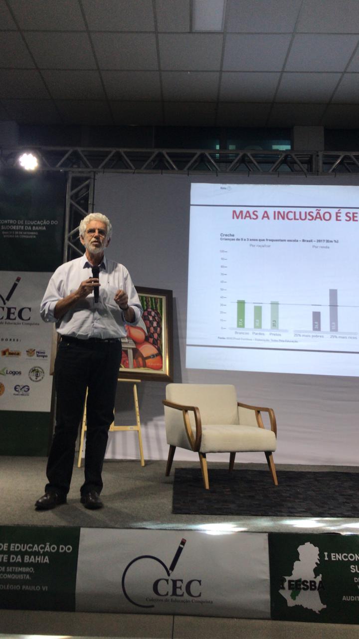 A vida é uma escola, quem traz, acaba levando também. Quando o Coletivo, composto por escolas da rede privada de educação, convidou o César Callegari para abrir a programação do Primeiro Encontro de Educação do Sudoeste da Bahia o fez na certeza de que estava trazendo um dos grandes expoentes da educação no Brasil, homem de larga experiência no setor, de um currículo admirável. Fez jus a expectativa de todos, falando para um auditório repleto de educadores, num ambiente fraterno, cujo espaço fora cedido gentilmente pela direção do Colégio Paulo VI, a palestra transcorreu num clima de grande comemoração pela participação maciça da classe de professores e gestores.