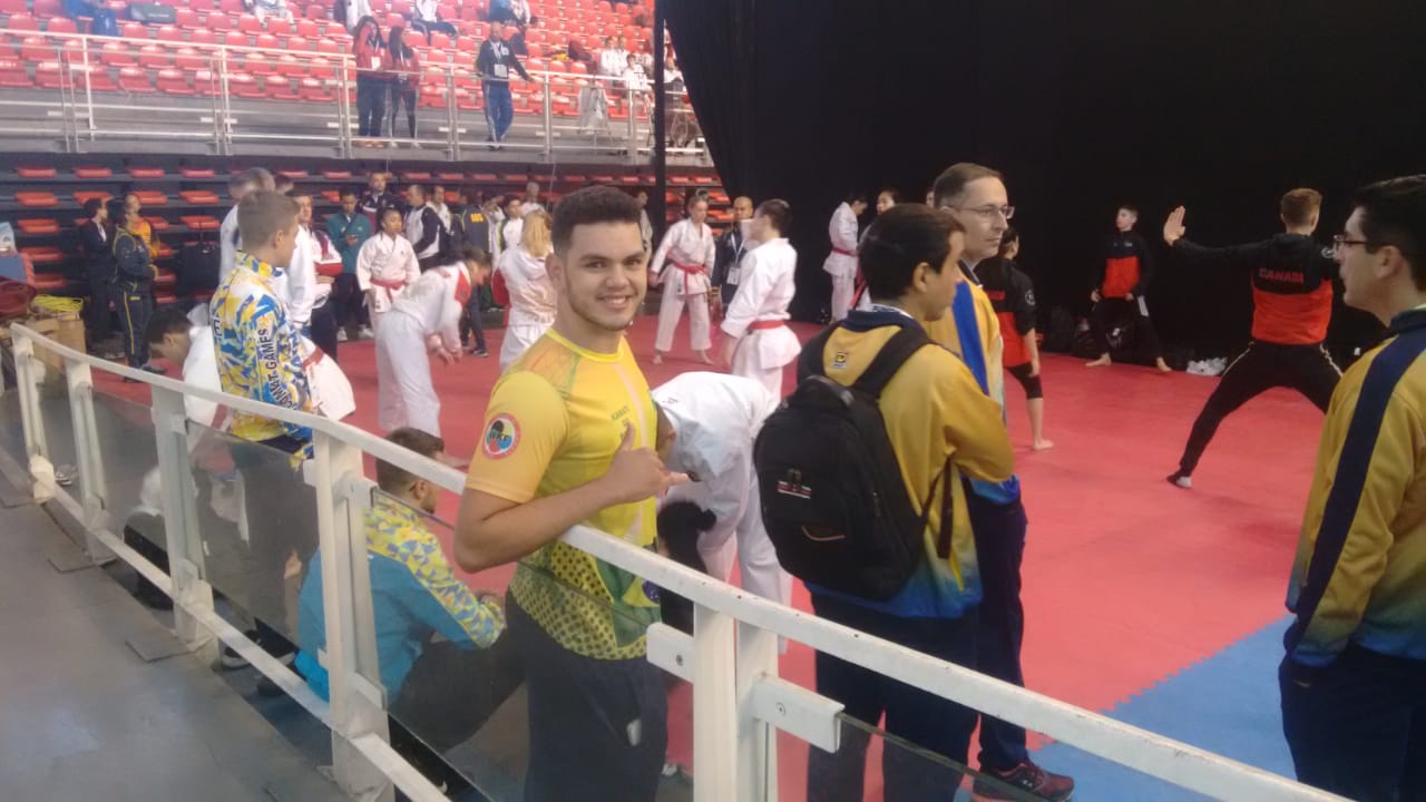 Atleta conquistense, Isaac Matos já se encontra no ginásio. É o Mundial de Karatê no Chile