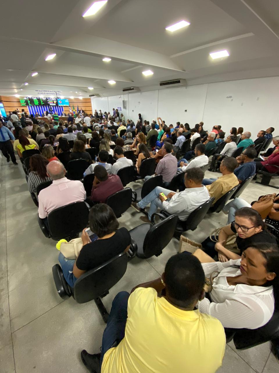 O prefeito Herzem Gusmão levou carga máxima junto de si ao plenário Carmem Lúcia. Todos os secretários, procuradores, assessores e também coordenadores fizeram-se presentes, deixando claro que o governo está unido e confiante para encarar o ano em curso que será de muito trabalho e também de muitos embates, sobretudo no que se refere a disputa eleitoral de outubro próximo. “Estou aqui para agradecer, a esta casa e a Deus, por tudo o que vem acontecendo com a nossa cidade, com a nossa administração”, disse o emedebista que continuou discursando sempre aplaudido pelos colaboradores. Herzem destacou tudo o que conseguiu com o apoio dos 21 vereadores, lembrou da Guarda Municipal, da recuperação financeira da Emurc e da aprovação dos empréstimos junto à Caixa que somam mais de 100 milhões de reais. “Ela está fazendo falta, não veio por um motivo justo, está em casa recuperando a sua saúde. Refiro-me a nossa abençoada vice-prefeita Irma Lemos”.