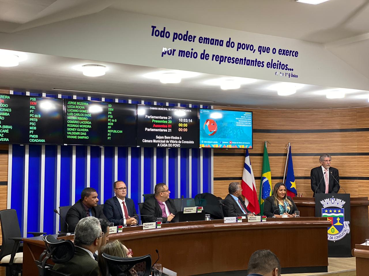 A Câmara Municipal de Vitória da Conquista foi aberta hoje para sua primeira sessão legislativa do ano de 2020 contando com todos os vereadores, exceto o decano Álvaro Pithon, pois encontra-se recolhido, saudoso da sua querida esposa que partira na última terça-feira.