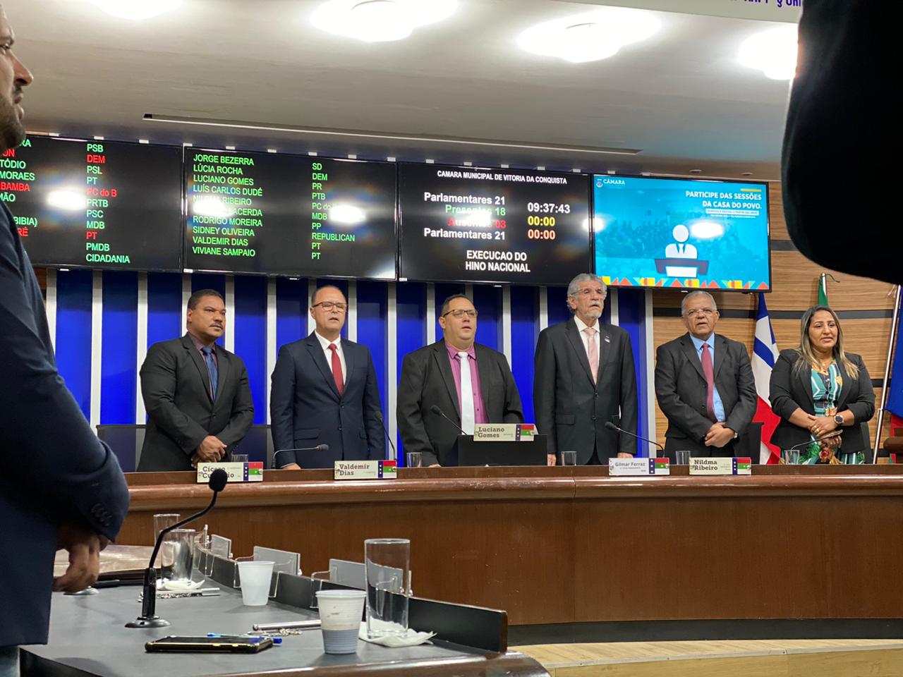 A Câmara Municipal de Vitória da Conquista foi aberta hoje para sua primeira sessão legislativa do ano de 2020 contando com todos os vereadores, exceto o decano Álvaro Pithon, pois encontra-se recolhido, saudoso da sua querida esposa que partira na última terça-feira.