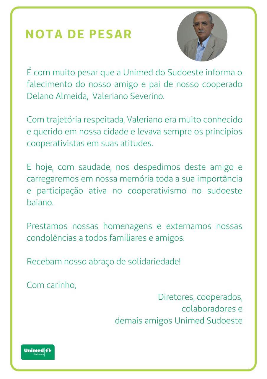 “A Câmara Municipal de Vitória da Conquista manifesta seu profundo pesar pelo falecimento de Valeriano Severino de Almeida, presidente do Sicoob CrediConquista (Cooperativa de Crédito do Sudoeste Baiano).