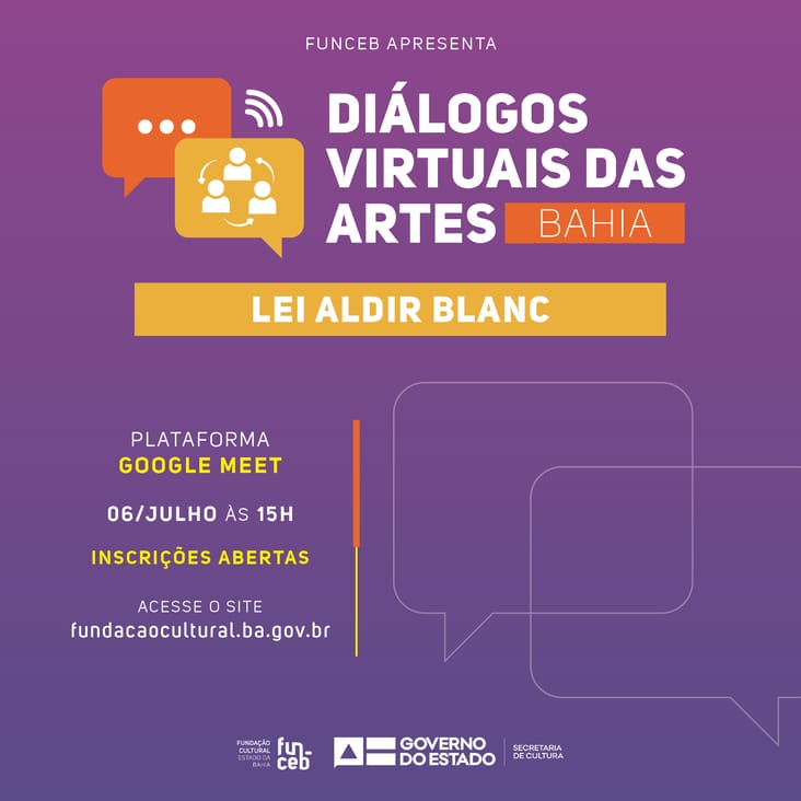 A Fundação Cultural do Estado da Bahia realiza na próxima segunda-feira (6), às 15h, os Diálogos Virtuais das Artes – Bahia para dialogar sobre a Lei Aldir Blanc. Os Diálogos têm como intuito reunir artistas, grupos, produtores e dirigentes culturais de setores artísticos da capital e do interior da Bahia para discutir políticas públicas para as artes, fazer reflexões sobre o campo artístico e investigar demandas do setor, com vistas à aplicação da Lei no estado.