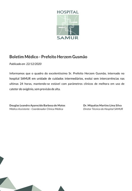 O boletim médico emitido no início da noite de ontem sobre o estado de saúde do prefeito Herzem Gusmão, internado desde a semana passada no Hospital Samur, não apresenta novidades e a expectativa de todos é que o prefeito passe o Natal em casa com a família. A ótima notícia é que a esposa do prefeito, a primeira dama Luci Freire, já está recuperada.