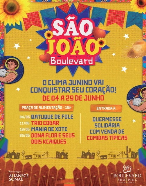 Chegou o mês de junho e já começamos a pensar na canjica de milho, pamonha, na roupa xadrez e nas bandeirolas para a Festa de São João. E para garantir esse clima junino será realizado entre os dias 04 e 29 de junho o São João Boulevard, com atrações de forró e uma quermesse com a comercialização de produtos típicos da época.