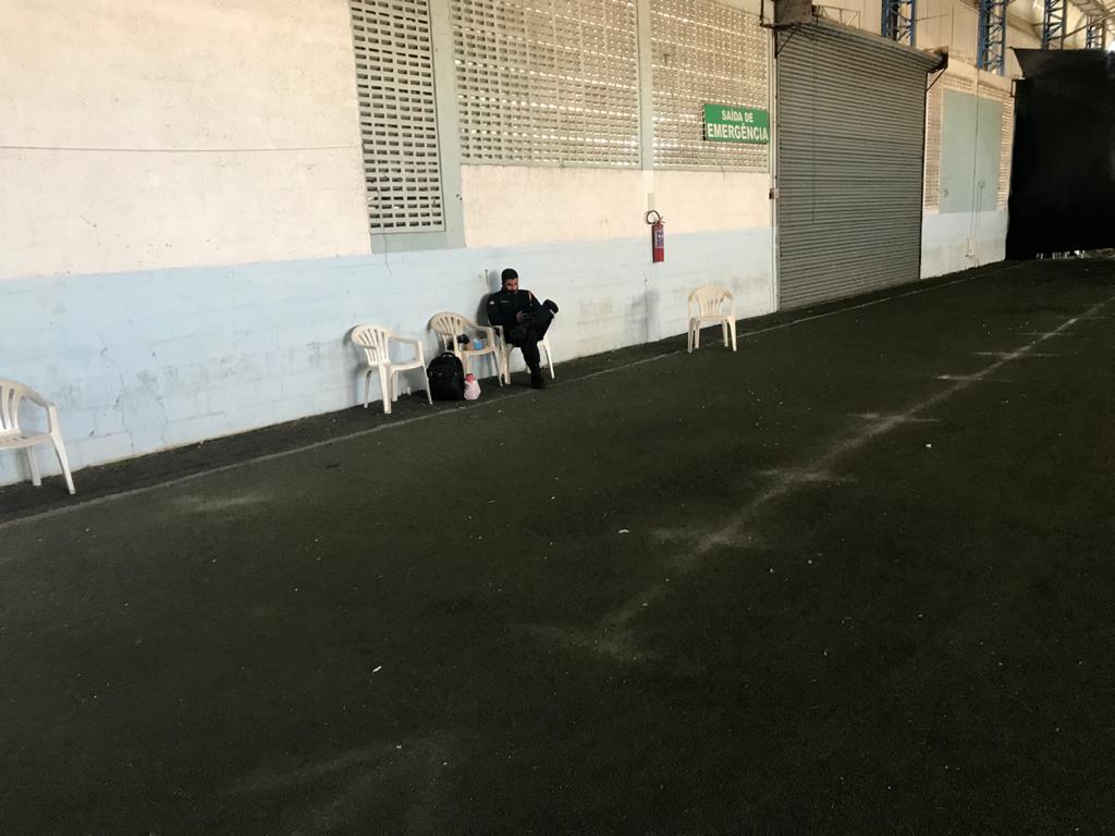 Olhem as fotos: cenário sombrio, ambiente fantasma, servidoras solitárias na portaria, segurança sozinho, cadeiras vazias, um visual inacreditável, não tinha ninguém, nem pra vacinar, nem “pra remédio”.