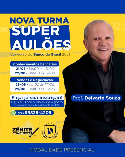 Então não perca os aulões do Prof. Delvarte Souza. Ele é funcionário aposentado do BB, possui larga experiência na área de concursos públicos, conhece as estratégias da Cesgranrio e leciona CONHECIMENTOS BANCÁRIOS e VENDAS/NEGOAÇÃO há mais de 12 anos. Graduado em Comunicação, especialista em Marketing Estratégico e mestre em Linguagens. :: LEIA MAIS »