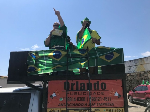 Próximo ao Centro de Cultura os primeiros carros que vinham da Avenida Olívia Flores, faziam um barulho ensurdecedor, buzinando e cada um levando quatro pessoas que tinham como destino final a Praça da Bíblia, onde foi encerrado o ato de apoio a “democracia e contra a corrupção”.