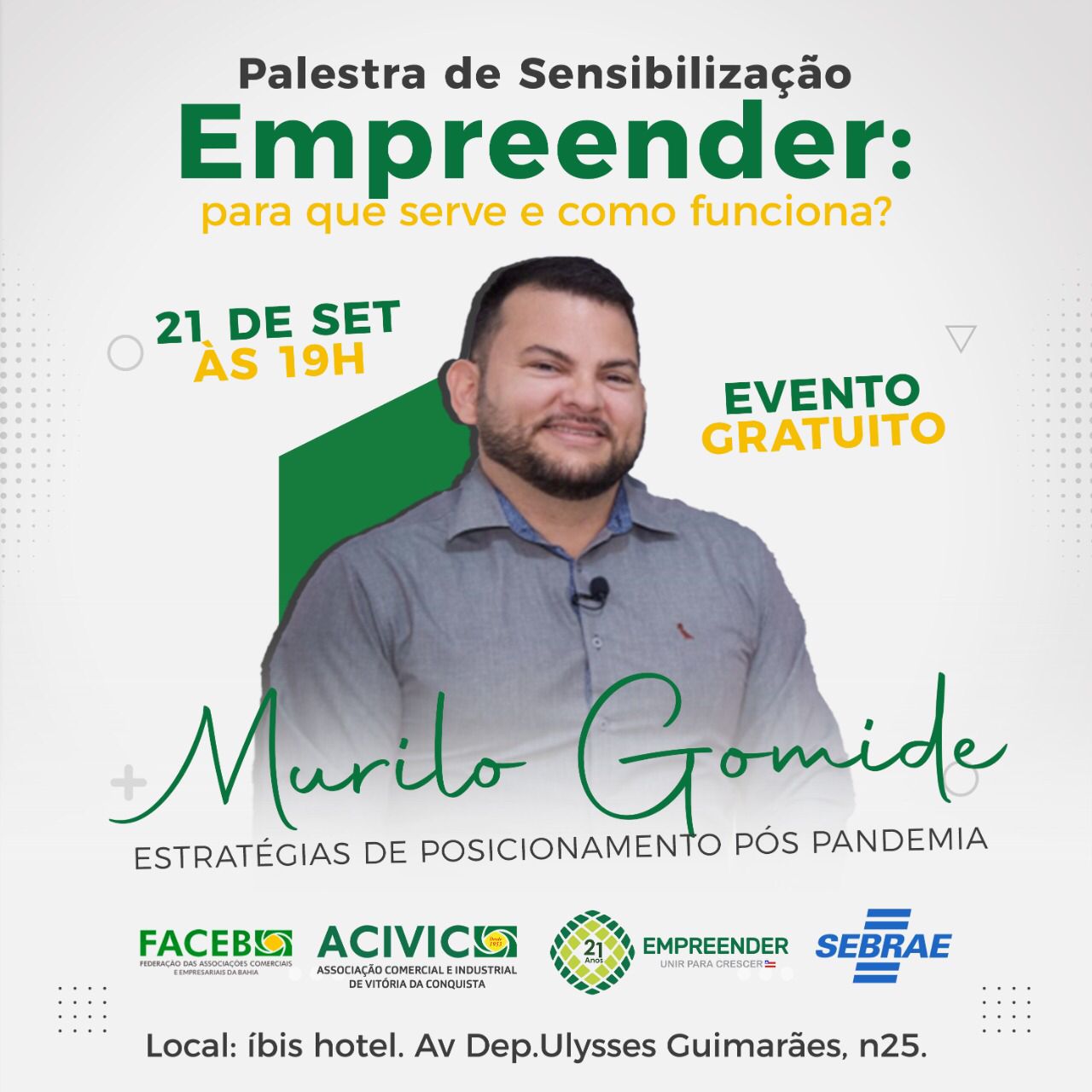 Amanhã, terça-feira, 21/09, às 19h no Hotel Ibis, à Avenida Ulysses Guimarães, acontecerá uma importante palestra que será apresentada por Murilo Gomide, tendo como tema Estratégias de Posicionamento Pós Pandemia.