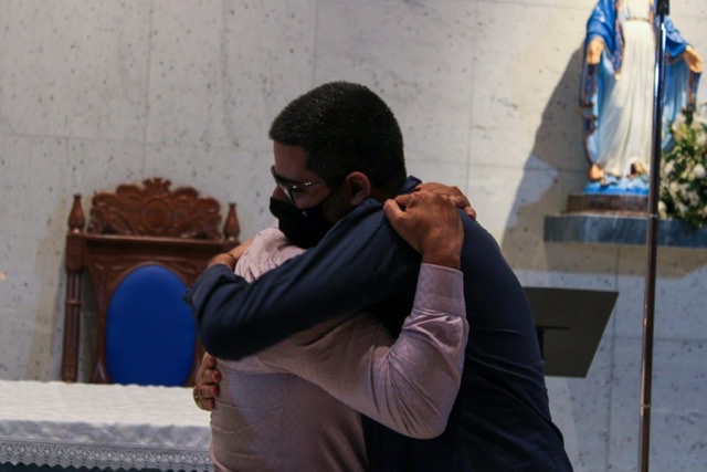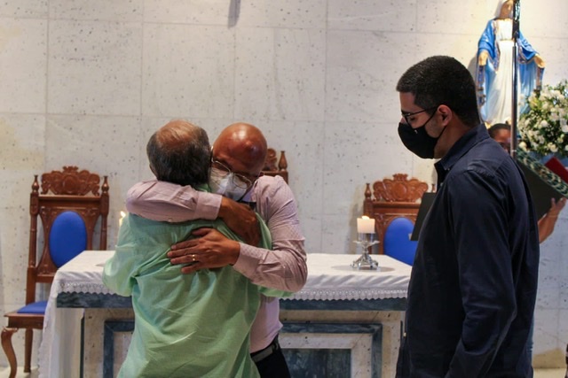 O padre Valmir na sua fala pediu ao Senhor para “que você viva mais 50 anos, Dudé”.
