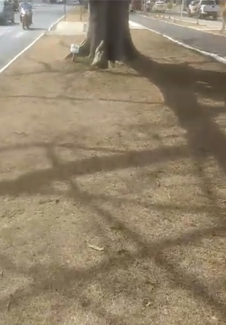 Grama seca na Olívia: “A gente cuida, mas nessa época do ano é assim mesmo”, explica a secretária Ana Cláudia, do Meio Ambiente