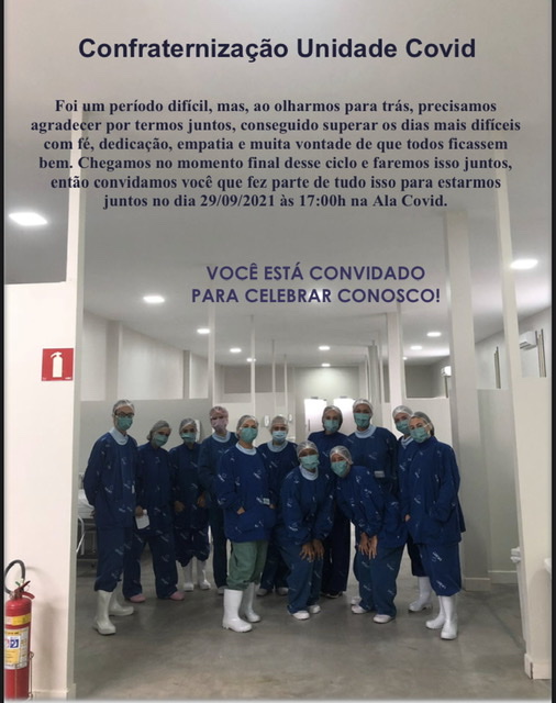 Hoje, às 17h, na Ala Covid do hospital, em clima de dever cumprido, os profissionais da área de saúde vão agradecer à Deus por tudo que fizeram pelos seus irmãos, e o fazem em clima de despedida, em clima de adeus ao Coronavírus que está definitivamente indo embora.