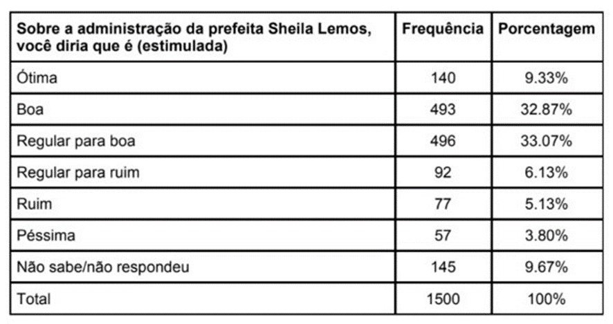 Não obstante os números positivos, a prefeita Sheila Lemos sorri levemente, sem euforia, com ares de satisfação, mas não infla, recebe com carinho e satisfação o resultado da pesquisa que a coloca em situação confortável diante da população.