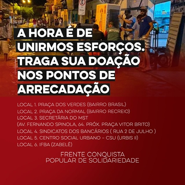 Um gesto de civilidade e maturidade política foi praticado pelos partidos de esquerda que formam a Frente Conquista Popular, constituída ainda por agremiações e sindicatos ligados aos movimentos sociais, colocando-se à disposição da prefeita Sheila Lemos e da Câmara Municipal para ações conjuntas em defesa da população conquistense que vem sofrendo com os prejuízos causados pelas fortes chuvas que caem sobre a cidade. Integrados ao movimento estão os vereadores de oposição e também os deputados Zé Raimundo e Waldenor Pereira.