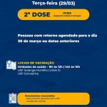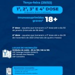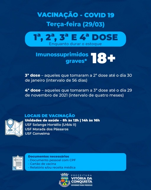 Nesta terça-feira (29), a vacinação contra a Covid-19 será feita nas unidades de saúde, de 8h às 12h e de 14h às 16h, com distribuição de senhas. Terá 2ª dose para crianças; 1ª e 2ª dose para adolescentes; 1ª, 2ª e 3ª dose para adultos, gestantes e puérperas, além da 4ª dose para os imunossuprimidos.