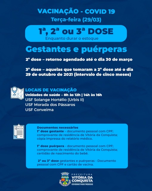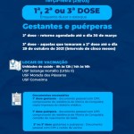 Para as gestantes e puérperas, terá a 1ª dose, a 2ª dose com retorno agendado até o dia 30 de março, ou 3ª dose para aquelas que completaram o esquema vacinal com duas doses até o dia 29 de outubro (intervalo de cinco meses).