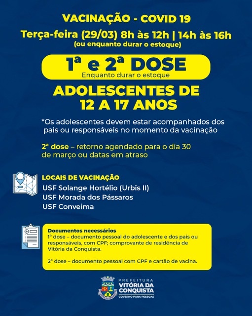 Adolescentes e crianças – Os adolescentes de 12 a 17 anos que ainda não se vacinaram com a 1ª dose ou tem o retorno agendado da 2ª dose para 30 de março ou datas em atraso, poderão se vacinar nas unidades Solange Hortélio (Urbis II), Morada dos Pássaros e Conveima, acompanhados dos pais ou responsáveis.