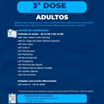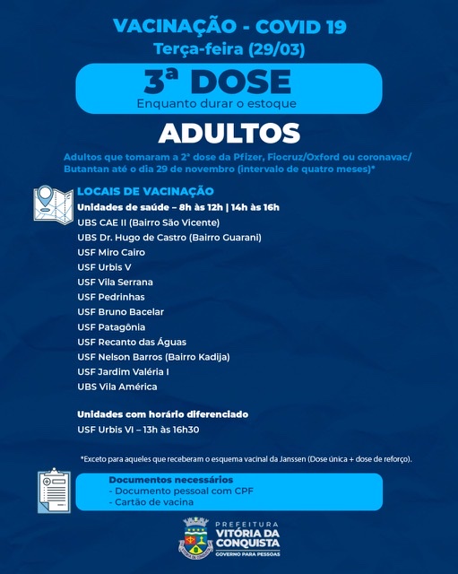Adultos – A 3ª dose estará disponível em 13 unidades para quem tomou a 2ª dose até o dia 29 de novembro de 2021. São elas: UBS CAE II (Bairro São Vicente), UBS Dr. Hugo de Castro (Bairro Guarani), USF Miro Cairo, USF Urbis V, USF Vila Serrana, USF Pedrinhas, USF Bruno Bacelar, USF Patagônia, USF Recanto das Águas, USF Nelson Barros (Bairro Kadija), USF Jardim Valéria I e UBS Vila América. Somente na USF Urbis VI a vacinação é de 13h às 16h30.