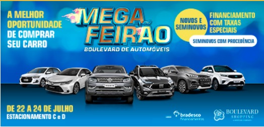 No próximo final de semana, dias 22 a 24 de julho, os Estacionamentos C e D do Boulevard Shopping Vitória da Conquista serão palco do Mega Feirão Boulevard de Automóveis. Com uma megaestrutura, quem passar pelo evento vai poder visitar os stands de 20 concessionárias, aproveitar as condições especiais em veículos novos e seminovos e outras atrações especiais como food trucks, DJ e música ao vivo.