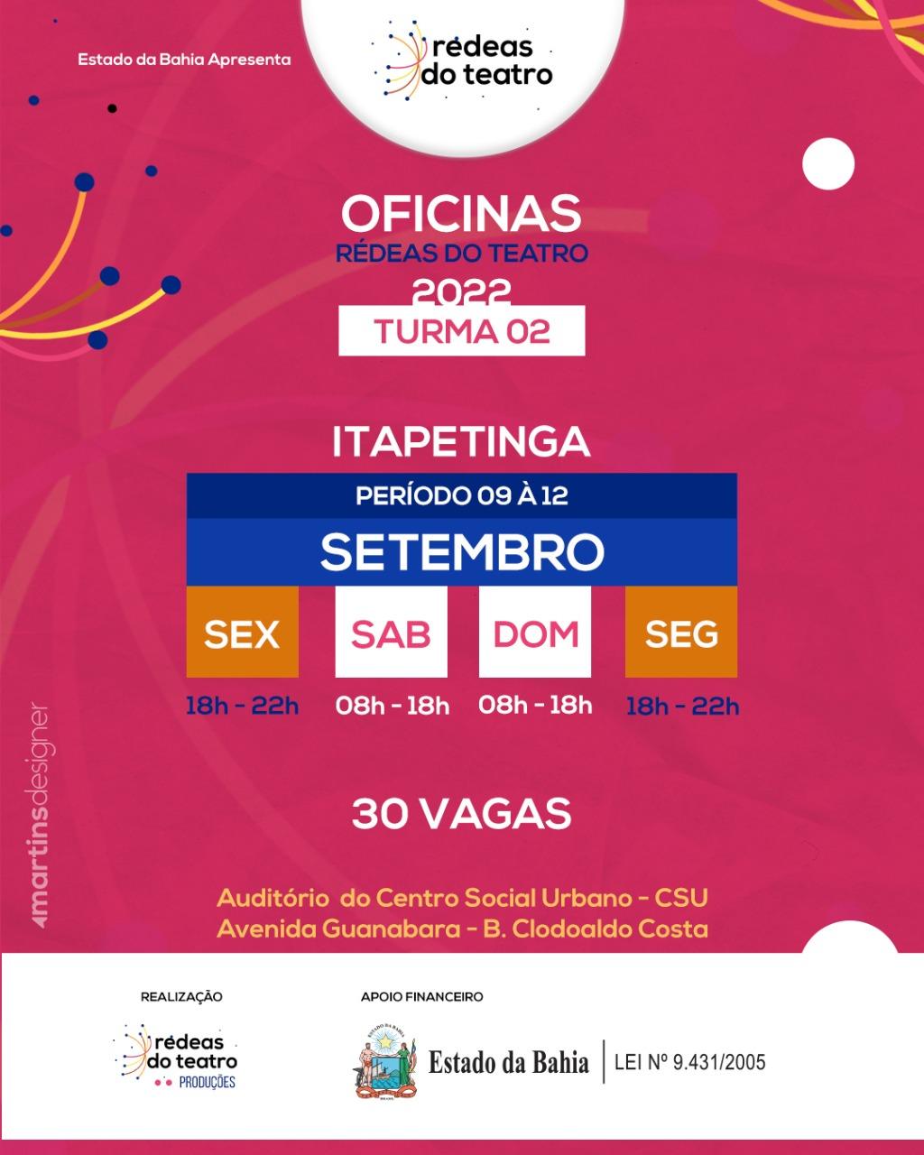 Turma 1: De 09 à 12 de setembro de 2022 (sexta, das 18h às 22h, sábado e domingo das 08h às 18h, e segunda das 18h às 22h) – Vitória da Conquista – Centro de Cultura Camilo de Jesus Lima; 30 vagas.