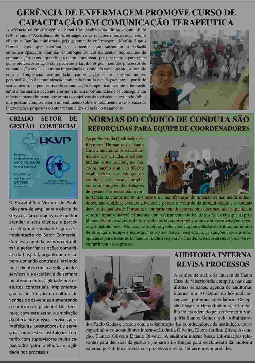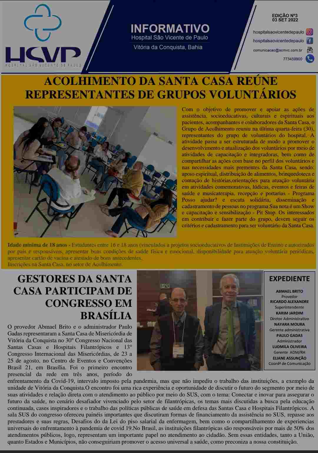 Nesta 3ª edição o Informativo da Santa Casa de Misericórdia tem a satisfação de anunciar a participação do Provedor e do Administrador no 30º Congresso Nacional das Santas Casas e 13º Congresso Internacional das Misericórdias e ainda trazer as novas atividades que serão desenvolvidas no hospital, como a criação do setor comercial, por meio do qual será ampliada a atenção às ações de supervisão de contratos e parcerias com empresas públicas e privadas.