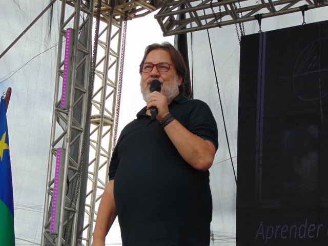 O professor Edgard Larry, secretário de Educação, idealizador do Festival, dividiu as honras de acolher professores e público com o secretário de Cultura e Turismo, Xangai, os dois felizes com o sucesso do evento.