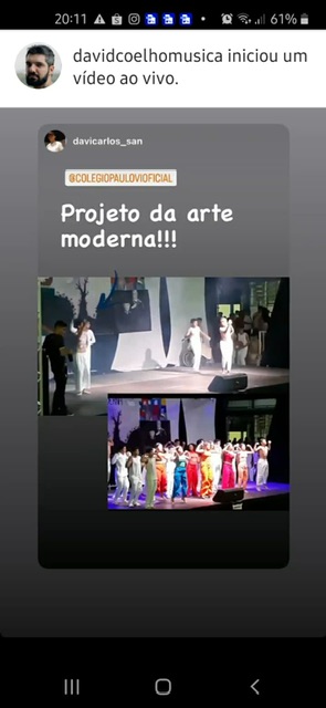 Estou me referindo ao Projeto de Literatura Vida e Arte, do Colégio Paulo VI. Fiquei encantado com tanta beleza e leveza para retratar a história da nossa arte, utilizando as linguagens da Literatura, Teatro, Dança e, principalmente, Música, por meio da qual foi feita uma viagem no tempo…