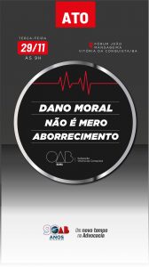 A OAB Bahia através da Comissão de Juizados Especiais, lançará a campanha “Dano Moral Não É Mero Aborrecimento”, tema debatido e aprovado no último Colégio de Presidentes, que aconteceu nos dias 17 e 18 de novembro. O Ato passará por todas as Subseções do estado e a OAB Subseção de Vitória da Conquista irá realizá-lo na próxima terça-feira (29.11), às 9h no Fórum João Mangabeira.