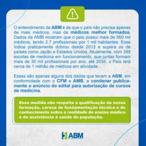 Esses são apenas alguns dos dados que levam a ABM, em conformidade com o CFM e AMB, a condenar publicamente o anúncio do edital para autorização de cursos de medicina.