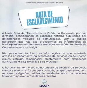 “A Santa Casa de Misericórdia de Vitória da Conquista, por sua diretoria, considerando as recentes noticias publicadas por determinados veículos de comunicação, vem a público esclarecer que não são procedentes as informações de inadimplemento da Secretária Municipal de Saúde de Vitória da Conquista com a instituição.