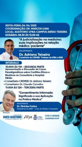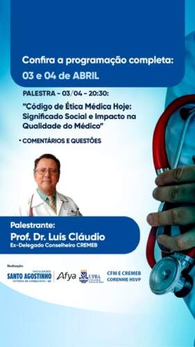 O evento é uma realização das Faculdades Santo Agostinho (Afya), Universidade Federal da Bahia (UFBA), Conselho Federal de Medicina (CFM), Conselho Regional de Medicina da Bahia (CREMEB) e COREME HSVP.